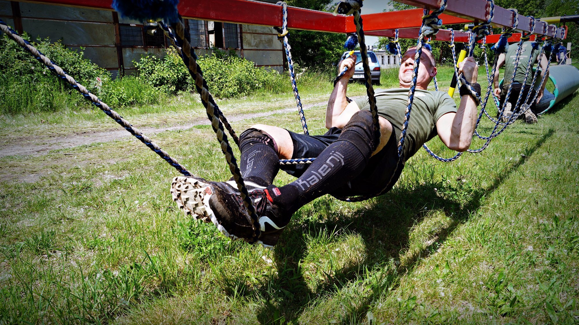 Az “A monkeybar” kicsit magas volt, de nem használtam a fellépőt, úgy voltam vele még pont elérem felugrásból. El is értem, majd lógtam mint egy zsák krumpli nulla lendülettel és néztem a szokásosnál távolabb lévő kapaszkodót. Majd elkezdtem magam belengetni ahogy a profi OCR versenyzőktől láttam és így sikerült lendületet kapnom és átfognom a következő kapaszkodóra, majd a következőre, ezt követően már volt annyi lendületem, meg annyi “csakazértis” bennem, hogy végig tudtam menni. 🙂